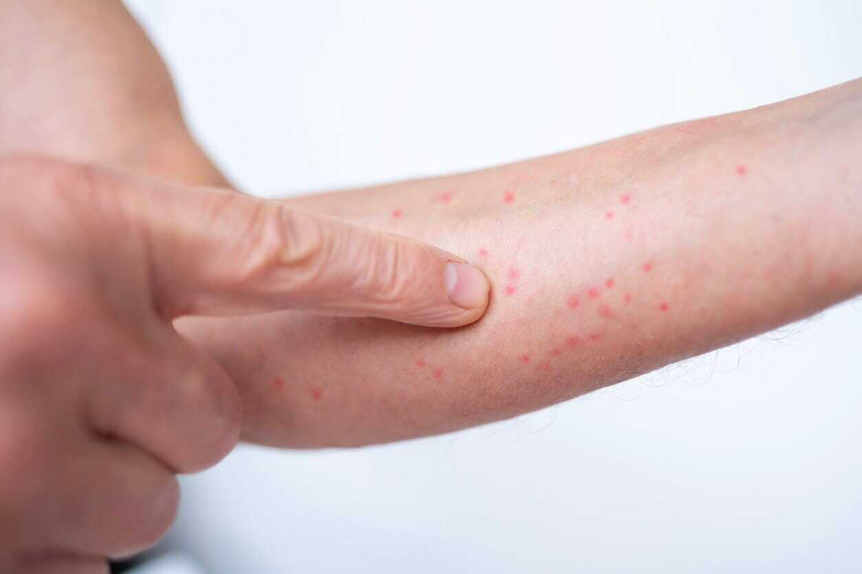 Inflamed skin with red spots on man's arm, symptoms conditions like chronic psoriasis, dermatitis or allergic response, topical medication