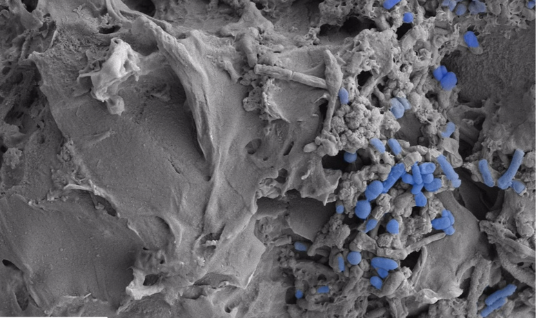 Imagen microscópica de microplásticos colonizados por la microbiota intestinal. - CSIC