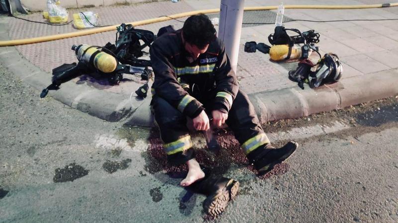 Los bomberos de Jaén están exhaustos después de varios días de intenso trabajo y lo han querido compartir a través de sus redes sociales. En la fotografía aparece Manuel Troyano que, sentado en la acera, está escurriendo sus calcetines rodeado de bombonas de oxígeno. "Dos grandes incendios han puesto en jaque al Parque de Bomberos pero, como siempre, hemos dado el 'do de pecho' para salir airosos de esta situación", comentaban en su página de Facebook.
