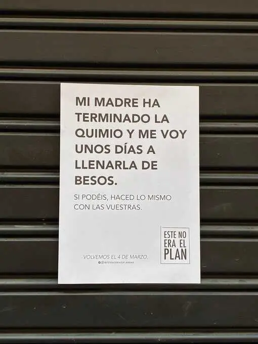 En el cartel puede leerse: "Mi madre ha terminado la quimio y me voy unos días a llenarla de besos. Si podéis, haced lo mismo con las vuestras. Volvemos el 4 de marzo". La dueña confirmó en la publicación: "Regreso a servirles cervecita fría el 4 de marzo", destacando así el motivo personal que justifica esta pausa.