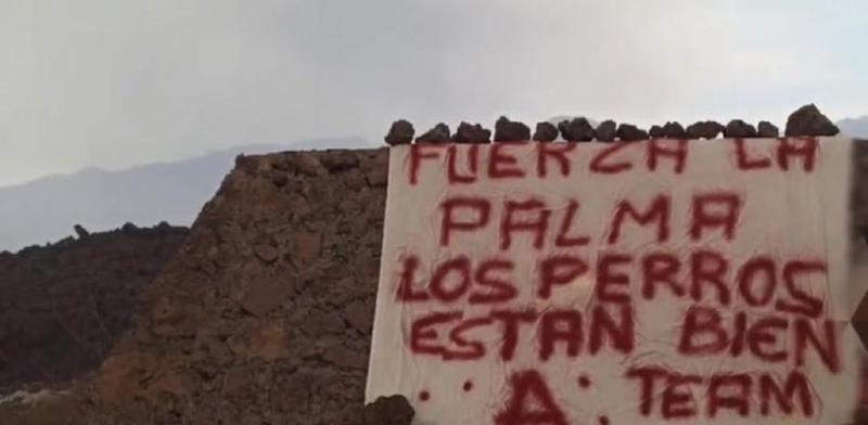 Tras casi dos semanas haciendo pruebas con los drones, un grupo que se hace llamar Equipo A, ha colgado una pancarta, supuestamente, en la zona restringida e inaccesible donde se lee "Fuerza La Palma. Los perros están bien", firmada por un misterioso A Team.